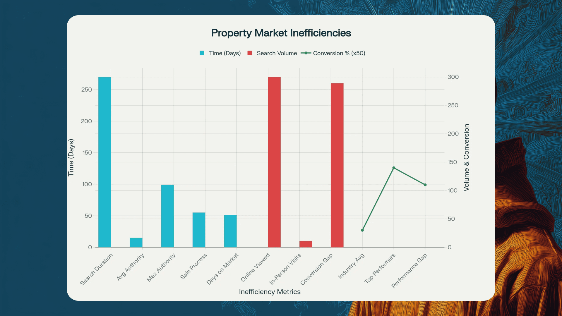 The customer journey is long and exhausting. Buyers spend around nine months searching, view 300 or more listings, and attend 11 or more inspections. Even after that effort, the industry average conversion rate hovers around 0.6%. Homes spend an average of 51 days on market, and sales stretch across 47–62 days from offer to completion. Every step carries friction: inconsistent listing quality, long waits for local searches, fragmented communication between parties.