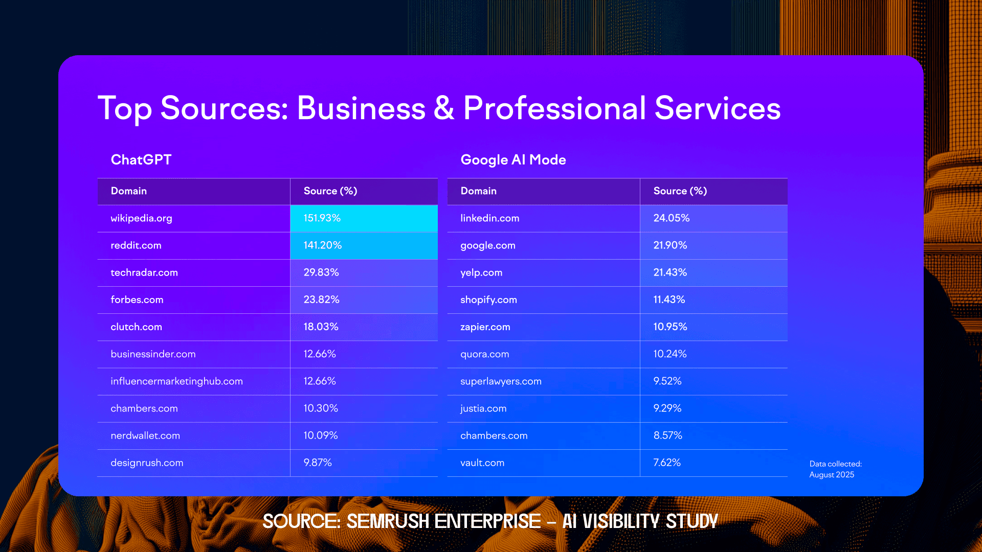 LinkedIn leads Google AI Mode citations at 24.05%, followed by Google's own properties (21.90%) and Yelp (21.43%). This reflects Google's deep reliance on its Knowledge Graph, business listings, and professional networks.The takeaway? Your Google Business Profile, LinkedIn presence, and review management are essential components of your AI visibility strategy.