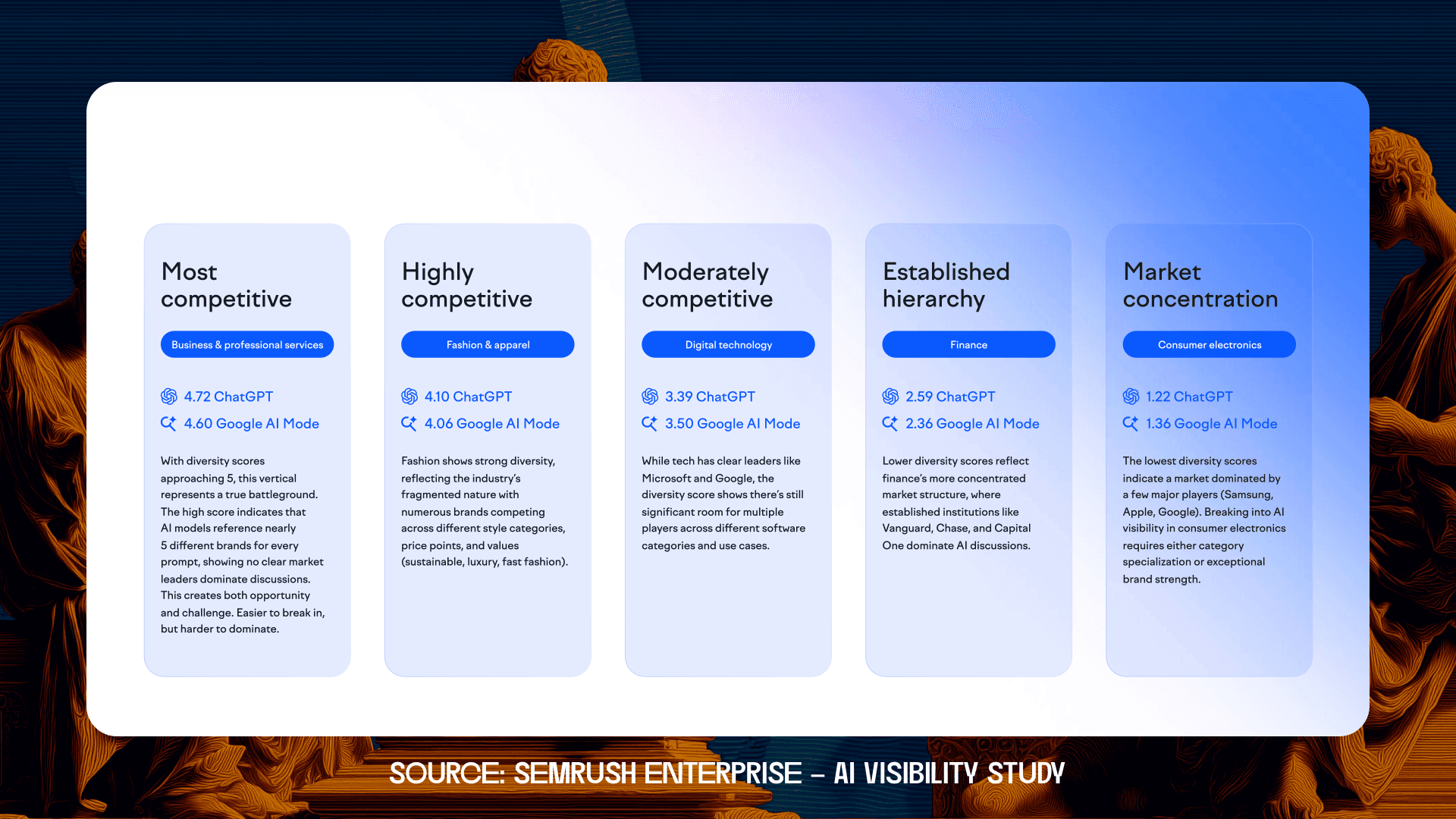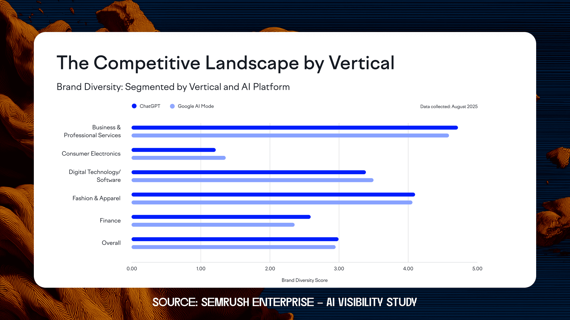 Market Concentration: Consumer Electronics (1.22 ChatGPT / 1.36 Google AI Mode) — The lowest diversity scores indicate a market dominated by a few major players (Samsung, Apple, Google). Breaking into AI visibility in consumer electronics requires either category specialization or exceptional brand strength.